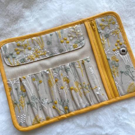 Updated as the previous listing no longer ships to the US. For this one specifically, 10 slots + 2 cm pocket width. Open to other similar products, too, but please one with a zipper pocket or ring for stitch markers.
