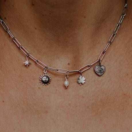 Collier + charms : citron, fraise, scarabée, perle poisson jaune, botte cow boy, sardine, co
