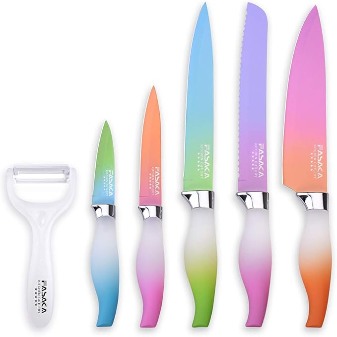 FASAKA 6 Piece Colorful Knife Set - 5 Kitchen Knives with 1 Peeler - Non-Stick Stainless Steel Chef