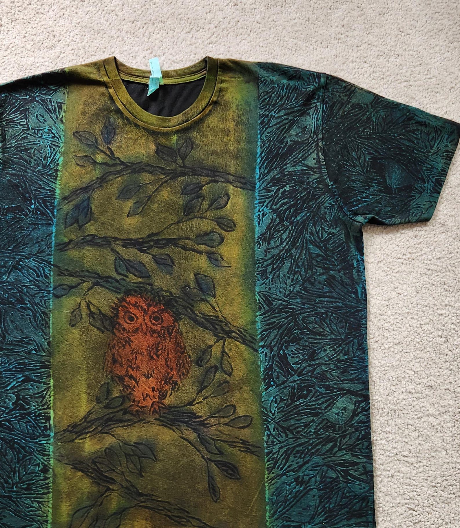 Baby Owl Perched on Leafy Branches, Small Birds, Leaves on Blue Background, Printed, Discharged, Dye