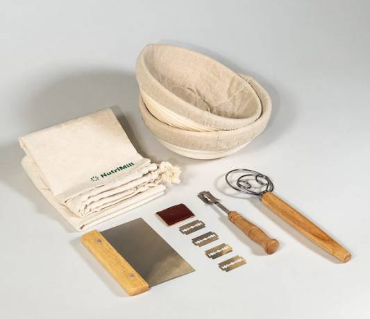 Un banneton avec sa doublure en tissu, un fouet danois, une lame de boulangerie