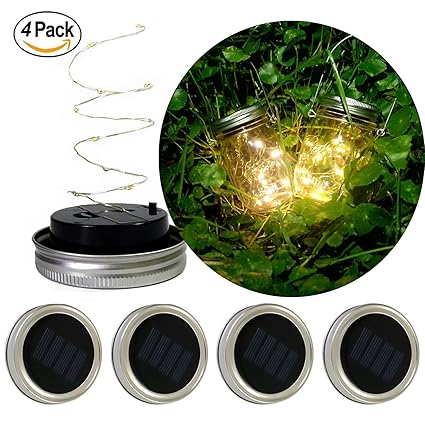 4 Pack - Solar Mason Jar Lights - Mason Jar Solar 10 LED String Fairy Star Lights Screw on Silver Li