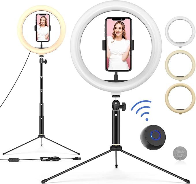 WONEW Anillo de Luz LED 10" de Escritorio, 3 Colores 10 Brillos con Regulables Bluetooth Control Rem
