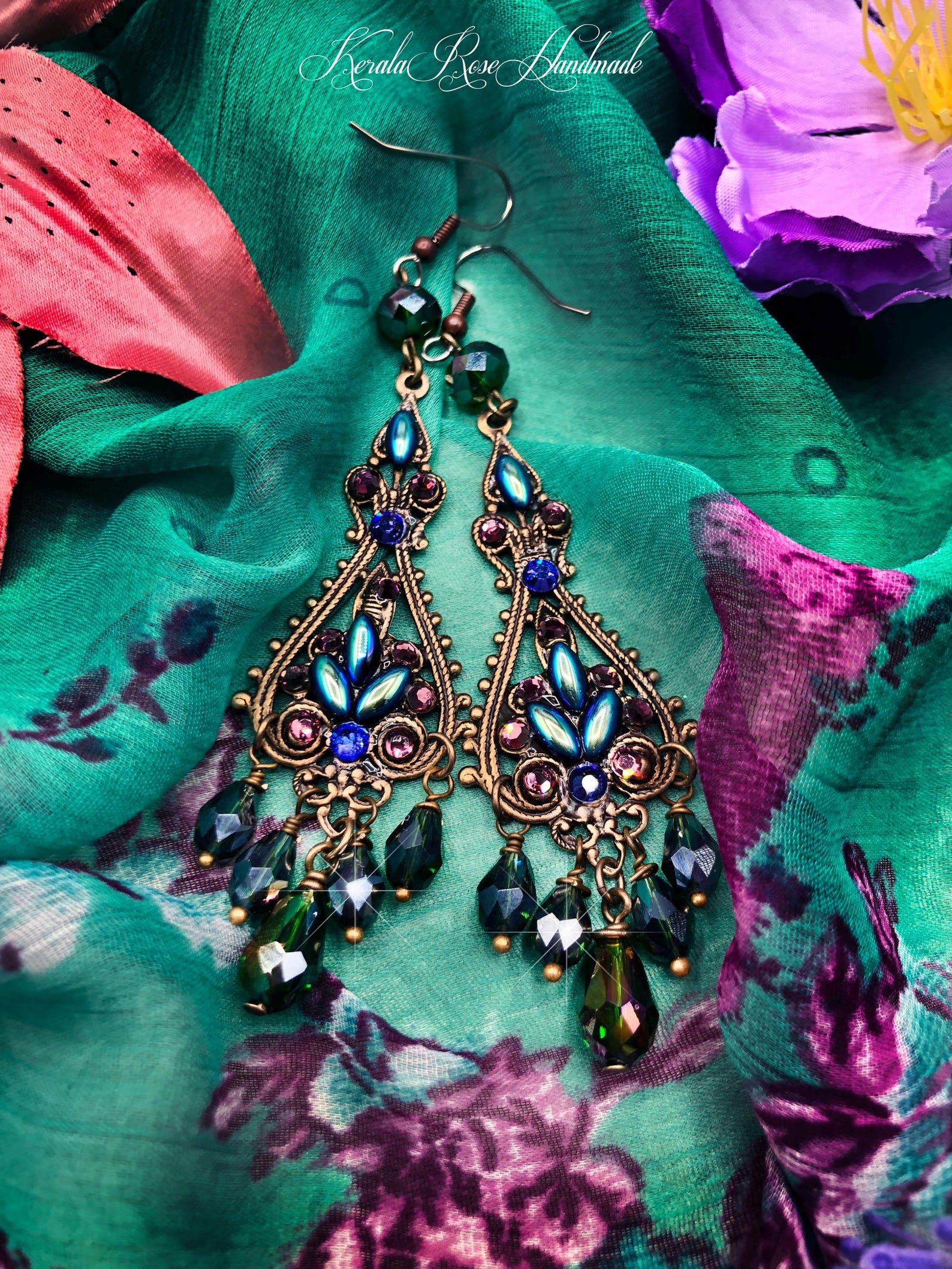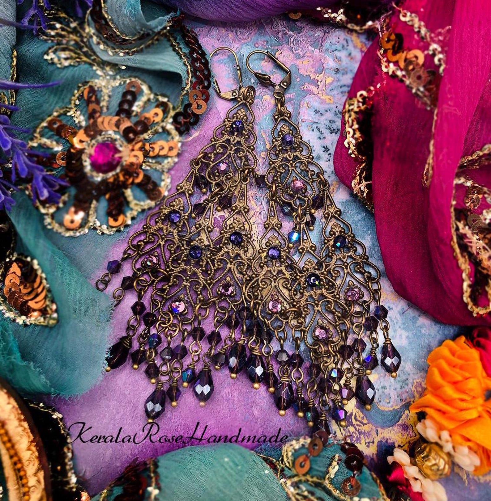 Mystical Chandelier Earrings – Long Filigree Design With Sparkling Crystal Beads & Rhinestones, Magi