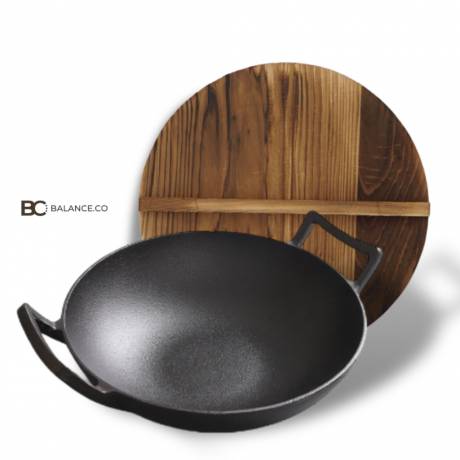 Balance.co Pre-seasoned Pure Cast Iron Flat Bottom Wok with Wooden Lid Outdoor Camping Kuali (36CM)