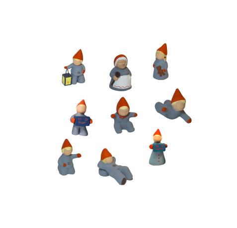 Tomtepojke med lykta, gammelmor, tomteflicka med nalle, tomteflicka med julklapp, tomtepojke med julklapp, tomtebaby sittande, tomtepojke liggande, tomtepojke på knä, tomtepojke vilande, tomteflicka med baby, tomtemor, tomtefar, tomteflicka med katt